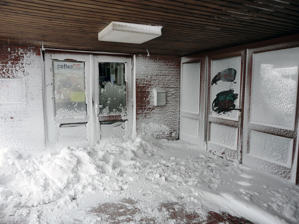 Ganz schön zugeschneit hier. Links ist die Eingangstür vom »Digger's« (ehemals »Biomaris«) zu sehen und rechts geht es in den Innenhof der Gemeinde- und Kurverwaltung bzw. zum Kurgast-Kindergarten oder ins Bauamt.