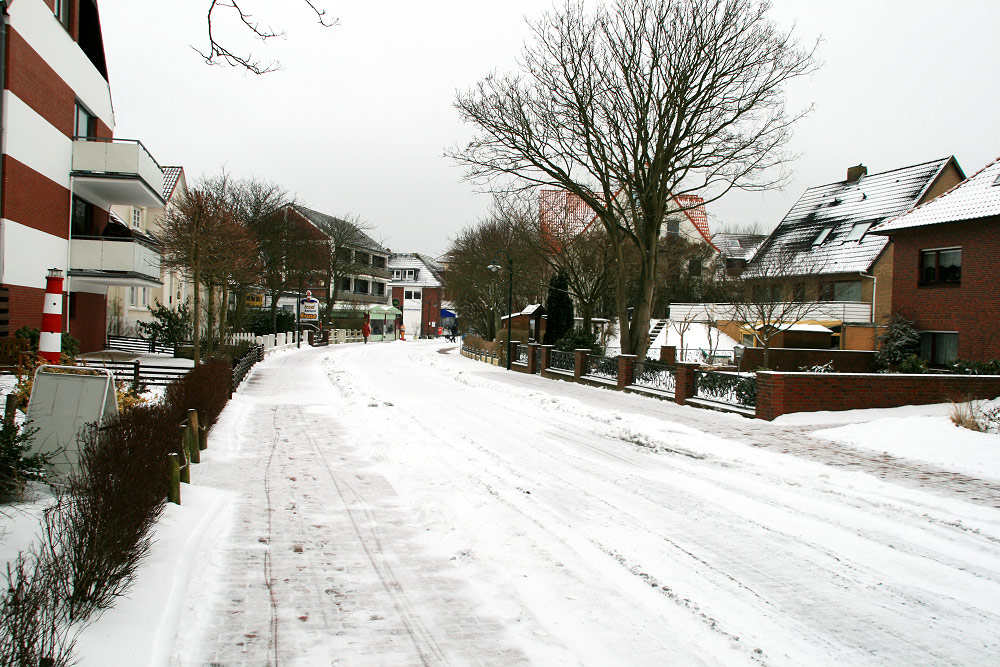Es hat geschneit, die Dorfstraße ist wieder weiß. Etwas weiter hinten sind die Inselbäckerei »Kruse« und der Drogeriemarkt »Schlecker« zu sehen.
