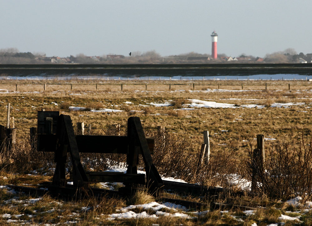 Ein Prellbock am Ende eines alten Ausweichgleises am Inselbahn-Haltepunkt »Westdorf«. Im Hintergrund sehen Sie das Inseldorf mit Altem Leuchtturm.
