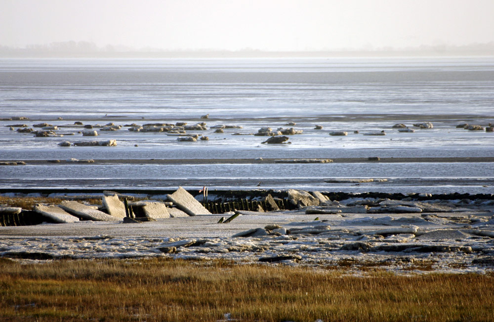 Die Flut hat zahlreiche Eisplatten vorm Deich abgeladen.