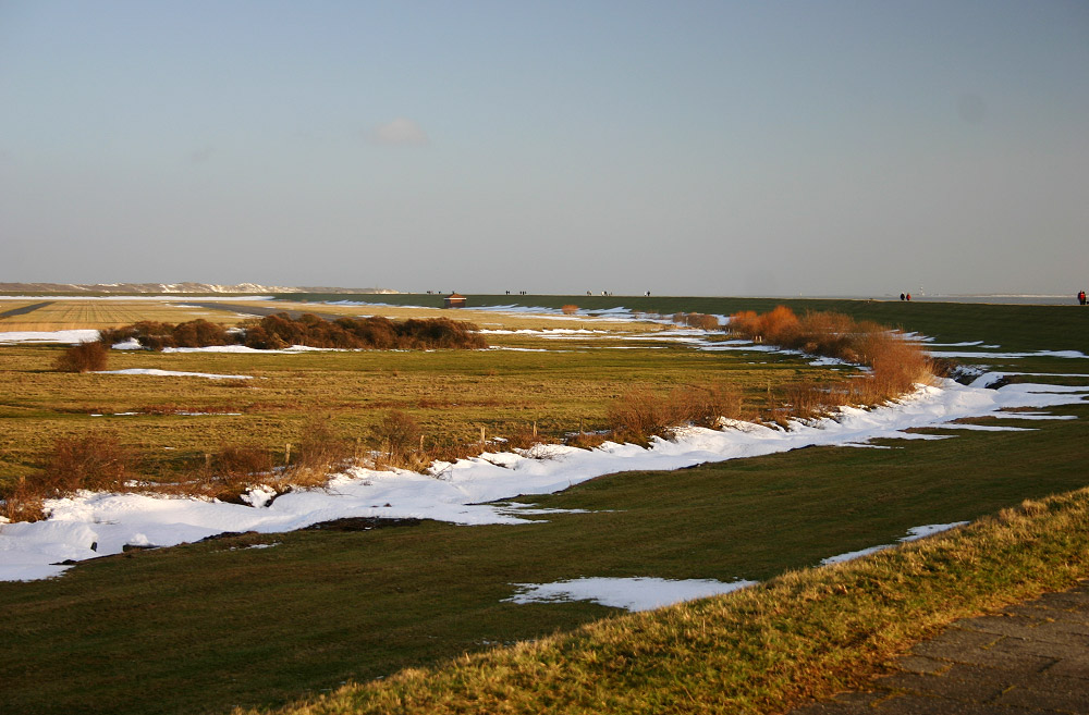 Der Ostgroden wird vom Ostgrodendeich umrahmt, auf dem wir uns hier gerade befinden. Durch den übrig gebliebenen Schnee kann man den Deichgraben gut erkennen, er verläuft immer parallel zum Deich.