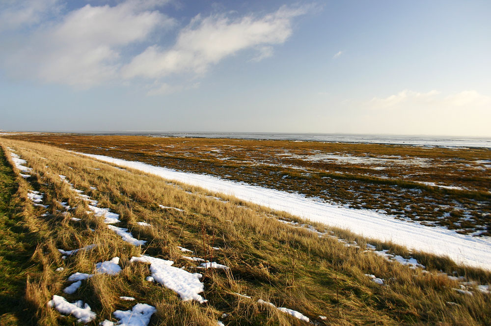 Wenn wir einmal nach Steuerbord blicken, sehen wir etwas weiter hinten das Wattenmeer, davor erstreckt sich ein breites Deichvorland, das aus Salzwiesen besteht.