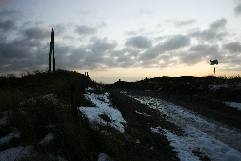 Kaum ist die Sonne hinterm Horizont verschwunden, wird es in riesigen Schritten dunkler. Dieses Foto zeigt Schneereste an der Überwegung »Neudeich«.