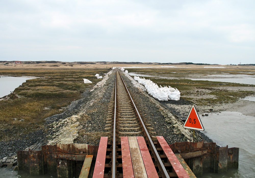 Blick auf die Gleisbaustelle. Hier bei den Aalkuhlen wurden im Februar und März 2011 die Gleise erneuert, dabei wurden 335 Meter Streckengleis um 18 Zentimeter erhöht, 280 Betonschwellen gewechselt, ca. 1060 Tonnen Gleisschotter eingebaut und 720 Tonnen Deckwerk zur Sicherung des Bahndamms installiert. Und das alles, ohne den »normalen« Zugverkehr zu beeinträchtigen.