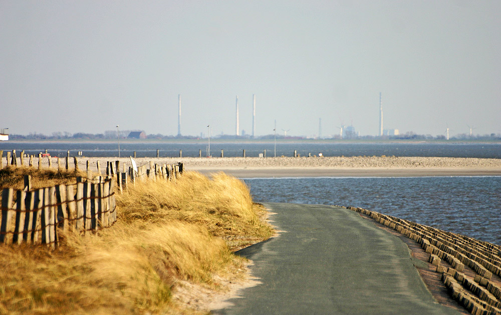 Die Wilhelmshavener Industrieanlagen (Ölraffinerie, Chemiewerk, Kraftwerk) mit den hohen Schornsteinen wirken zum Greifen nah, doch ich kann Sie beruhigen, die Entfernung zwischen Wilhelmshaven und der Insel ist ausreichend hoch, um die gesunde Inselluft nicht zu gefährden.