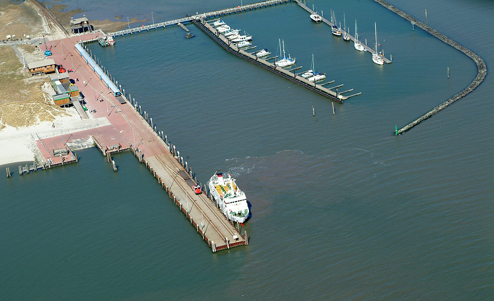 Das Motorschiff ›Harlingerland‹ legt gerade am hinteren Teil des Westanlegers an und die Inselbahn steht schon mit Flachwagen für die Gepäckcontainer bereit. Die Personenwagen stehen ein ganzes Stück entfernt, hier wird also gleich der erste Mini-Insel-Spaziergang fällig sein.