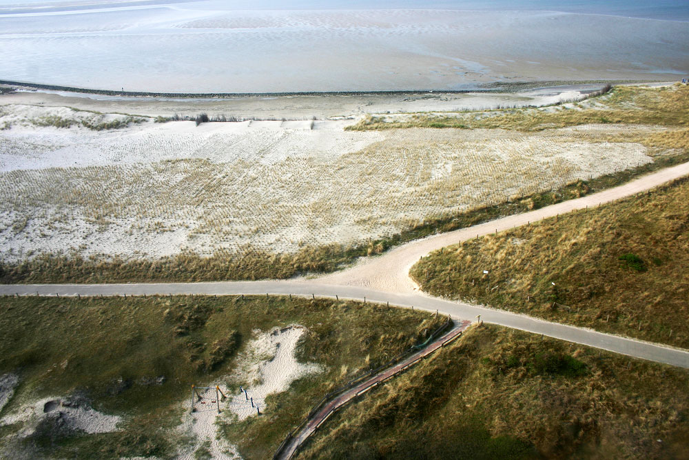 Unter uns ist die Straße zum Anleger zum Anleger zu sehen. Von ihr zweigen zwei Wege ab, Schräg nach oben geht es zum Südwestdeckwerk, nach unten dagegen zum Westturm.
