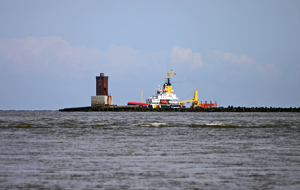 Das Gewässerschutzschiff »Mellum« passiert soeben im Jadefahrwasser die Insel Minsener Oog. Im Vordergrund sehen Sie noch einmal den Turm »Minsener Oog Buhne A«.