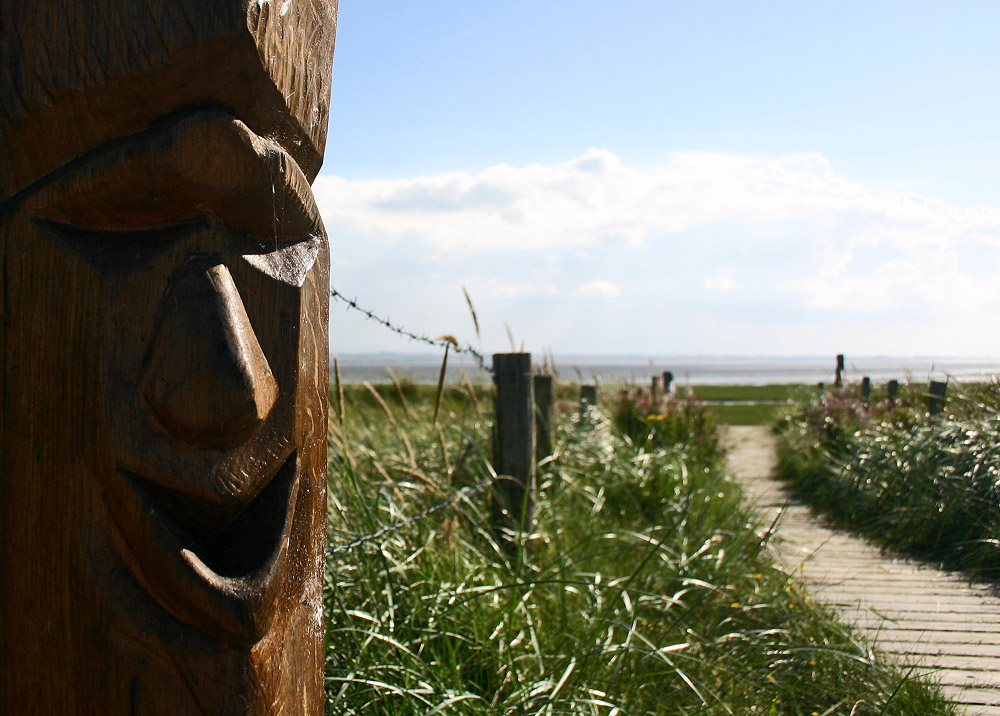 Ein Pfahl mit Gesicht – diese Kuriosität findet man gleich in zweifacher Ausführung bei der Aussichtsplattform in den Ostdünen.