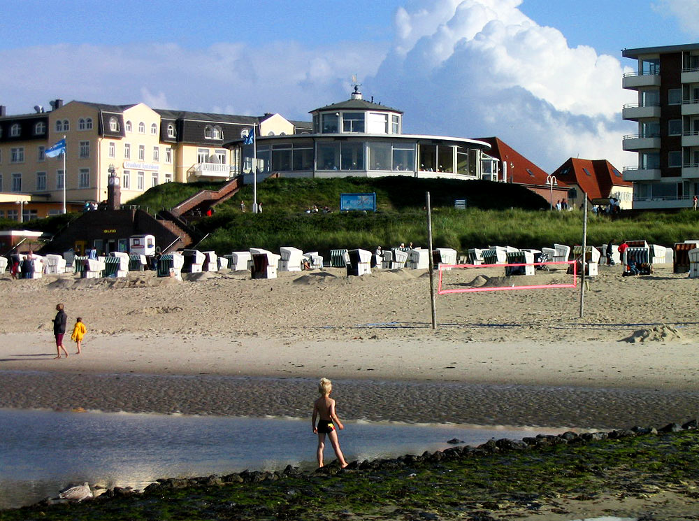 Die Mitte des Hauptstrandes und zugleich die Grenze vom West- zum Mittelfeld wird durch das »Café Pudding« bzw. die Uhr davor markiert. Die Volleyballfelder im Vordergrund werden im Hochsommer tagsüber von vielen Spielern bevölkert, doch jetzt ist es schon zu spät.