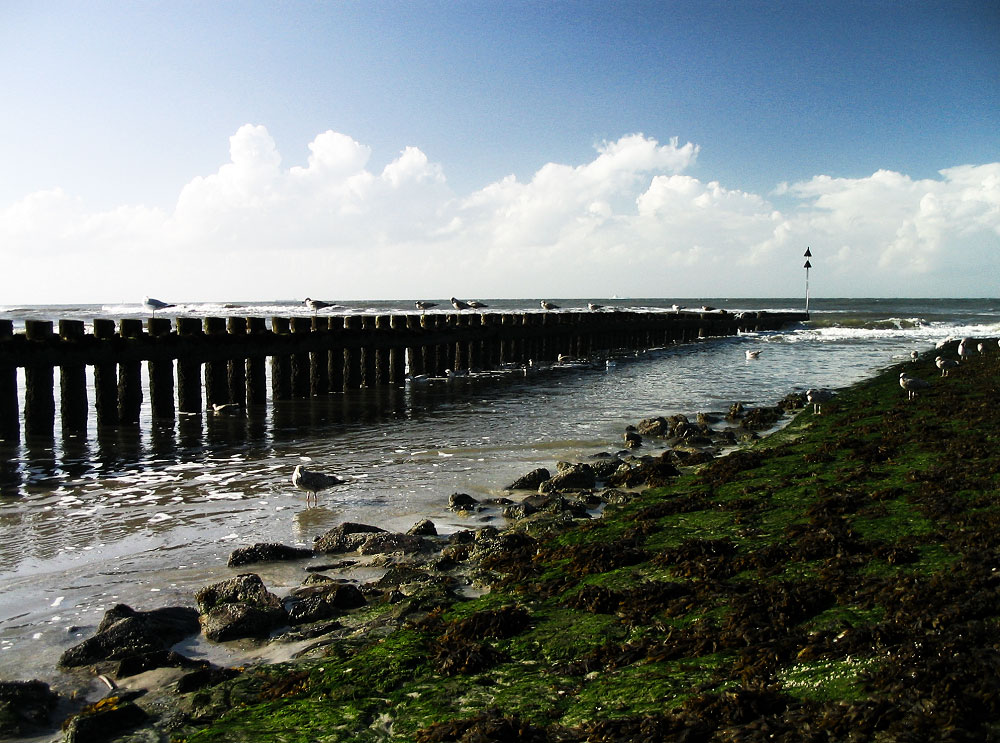 Damit der Sand besser gehalten wird, wurden neben einige Buhnen zusätzliche Pfahlreihen aufgestellt, deren Ende jeweils ein N-Toppzeichen markiert.