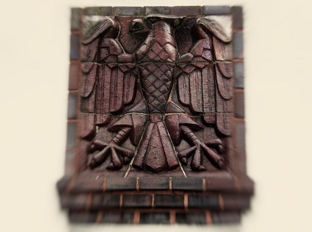 An der Fassade des Bahnhofsgebäudes befindet sich ein Adler, den wir auf diesem Foto sehen.