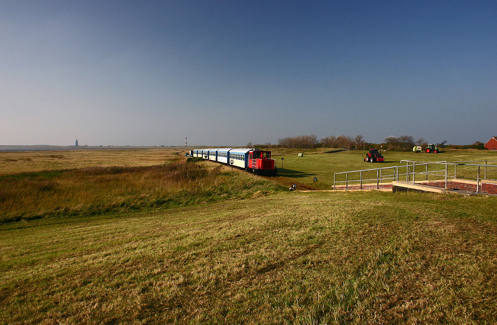 Während rechts gerade das trockene Gras zu Heuballen geformt wird, durchfährt die Inselbahn in Kürze das Deichschart. Im linken Drittel des Bildes sehen Sie das Deichvorland mit den Salzwiesen.