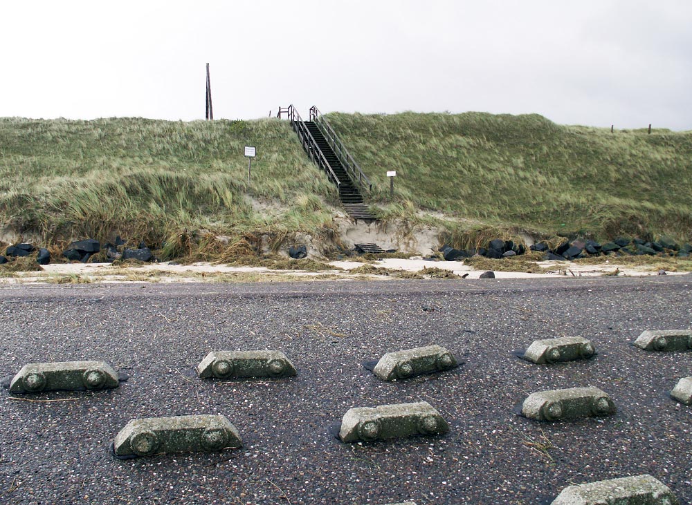 Diese Dünenüberwegung wurde bei der Sturmflut, die noch wenige Stunden zuvor hier tobte, im unteren Bereich zum Teil abgetragen.