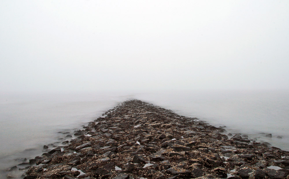 Welch ein trüber Wintertag! Die relativ lange Belichtungszeit von sechs Sekunden verwandelt die von der Brandung bewegte Wasseroberfläche zu einer diffusen Struktur.
