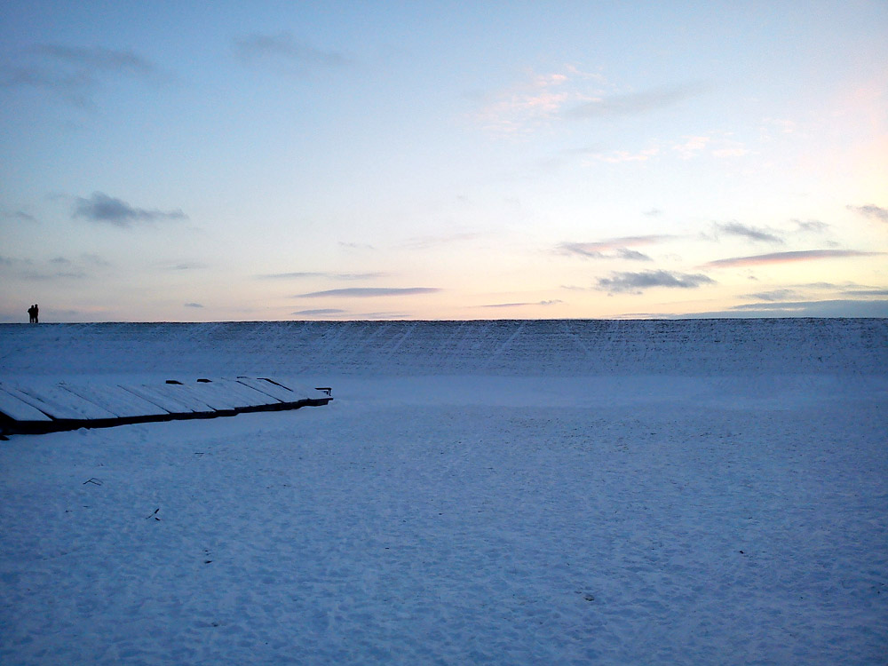 Weiße Weihnachten – im Jahr 2010 gab es sie mal wieder. Gut kann man auf dem Deich die Spuren zahlreicher Schlittenfahrer erkennen.