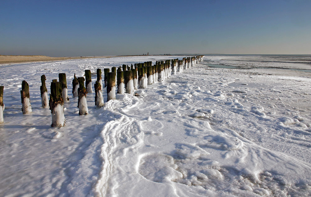 Ein Eispanzer umgibt die Pfähle der ehemaligen Bahnstrecke zum »Lloyd-Anleger« und auch auf dem Sandboden befindet sich eine dicke Schicht aus gefrorenem Meerwasser von schneeartiger Konsistenz.
