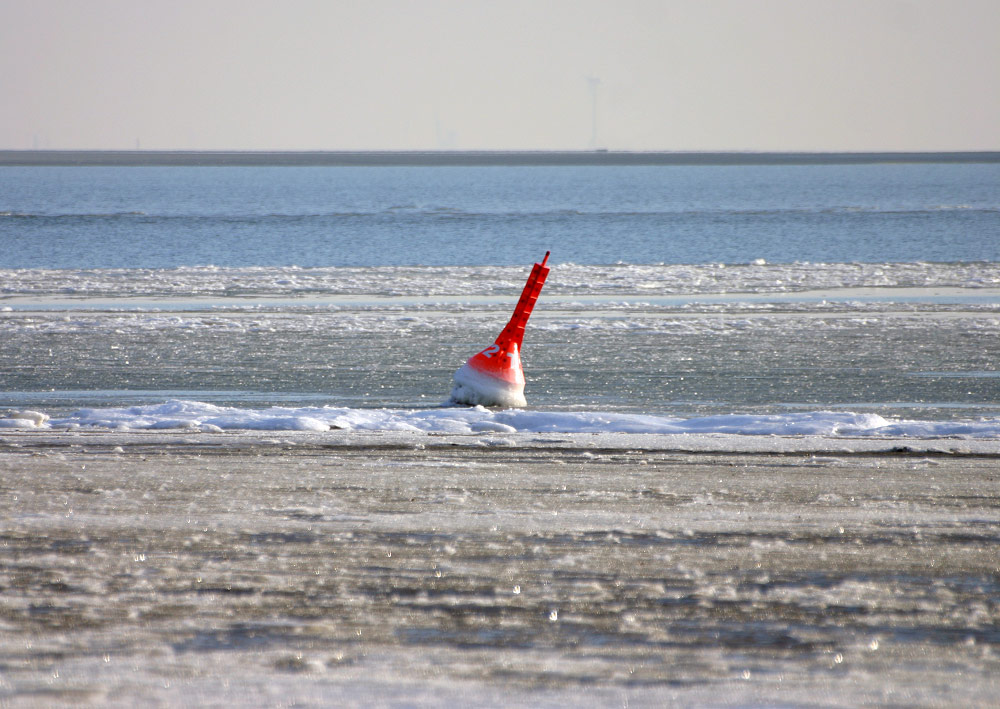 Die Backbordtonne des Wattfahrwassers zwischen zahlreichen dahintreibenden kleinen Eisschollen. Weiter draußen ist die »Blaue Balje« allerdings eisfrei.