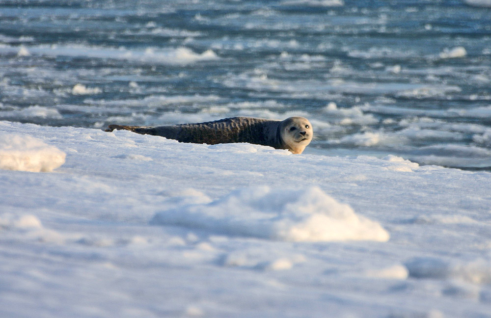 Sehen Sie nur, ein Seehund! Durchs Teleobjektiv hindurch kann man ihn richtig gut beobachten, auch mich hat er schon entdeckt. Aber ich bleibe in sicherer Entfernung, um ihn nicht zu stören.