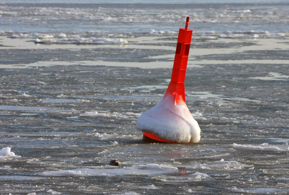 Ein weiterer Seehund schwimmt in der »Blauen Balje« inmitten treibender Eisschollen. Wir müssen aber keine Angst um ihn haben, durch eine dicke Speckschicht ist er bestens geschützt.