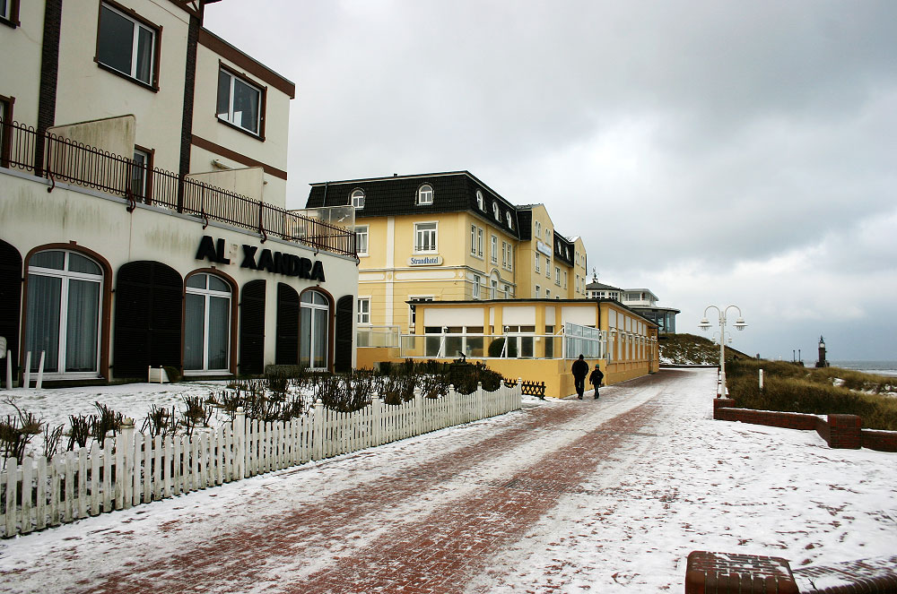 Eine sehr dünne Schneeschicht bedeckt die Strandpromenade nördlich des »Alexandra« sowie des »Strandhotel Gerken«.
