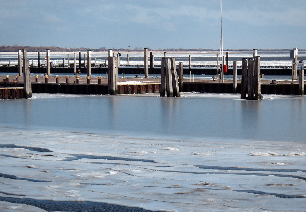 Da das Frachtschiff schon seit Tagen nicht mehr fuhr, hat sich im westlichen Hafenbecken am Wangerooger Anleger eine geschlossene Eisdecke bilden können – aufgrund der Tide und ständiger Bewegung ist sie natürlich nicht tragend.