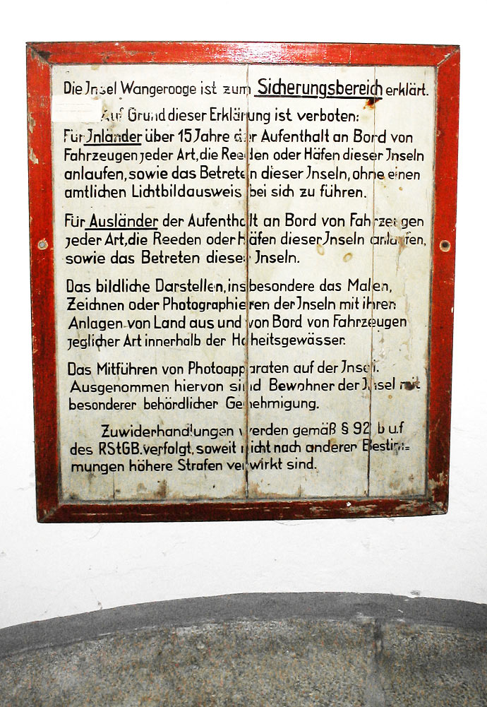 ‹ »Die Insel Wangerooge ist zum Sicherungsbereich erklärt« – diesen Worten folgen auf einem Schild aus dem II. Weltkrieg einige Erklärungen, was auf der Insel damals erlaubt war und was nicht. Verboten war beispielsweise das Mitführen eines Fotoapparates oder die Bildliche Darstellung der Insel, man fürchtete Verrat und Spionage.