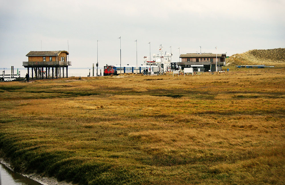 Die ankommenden Fahrgäste sind bereits von der MS ›Wangerooge‹ in die Bahn umgestiegen, gleich geht es für sie zum Dorfbahnhof.