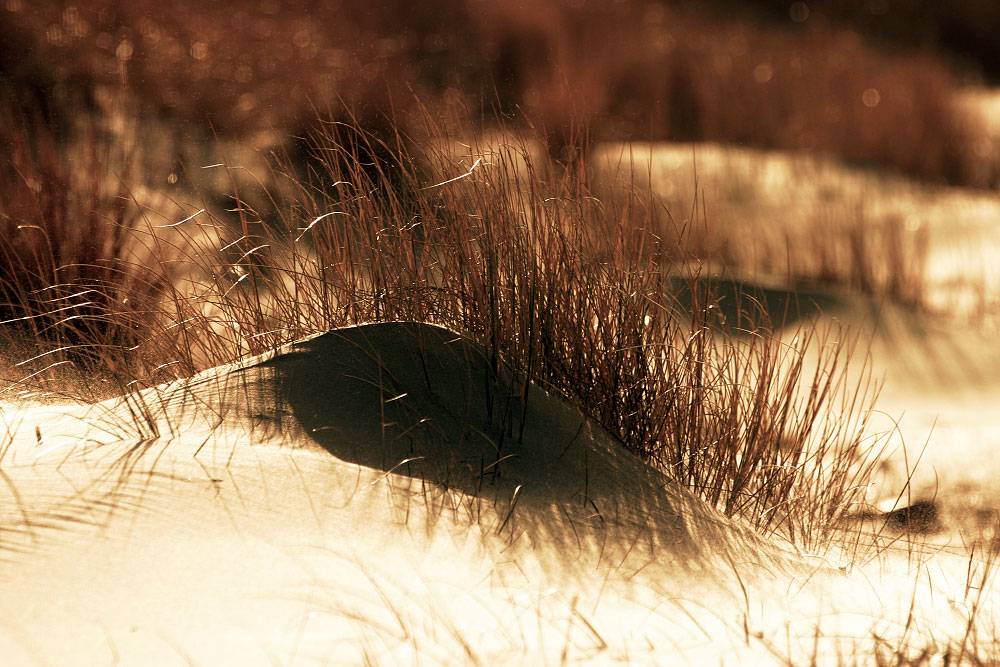 Schön sieht man hier, wie das Dünengras in seinem Windschatten den Flugsand fängt, ganz langsam entsteht auf diese Weise eine neue Küstendüne. Durch Sturmfluten kann das Ganze aber schnell wieder zunichte gemacht werden.
