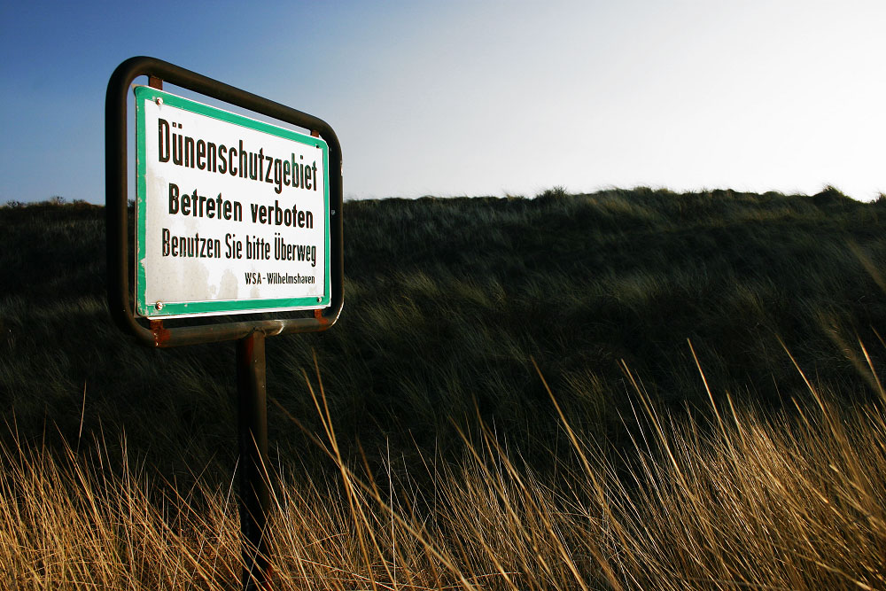 Dieses Schild befindet sich an der östlichsten Dünenüberwegung der Insel. Die empfindlichen Dünen dürfen nicht betreten werden, da allzu viele Fußspuren gravierende Schäden hervorrufen könnten.