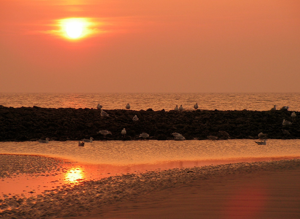 Auf einer Buhne haben sich einige Möwen niedergelassen, die fressen, ihr Fell putzen oder einfach nur dastehen.