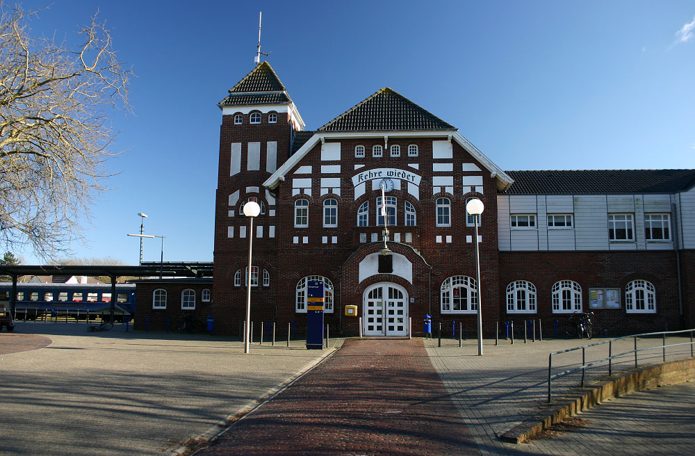 Das südliche Ende der »Zedeliusstraße« wird durch den Bahnhofsvorplatz markiert. Zur Zeit herrscht Betriebsruhe, der letzte Zug ist bereits um 15 Uhr abgefahren, die letzte Ankunft des Tages war um ca. 16:50 Uhr.
