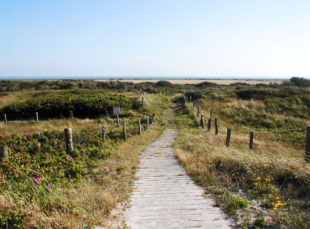 Die Position, von der dieses Foto entstand, könnte man heute nicht mehr betreten, zumindest nicht auf den Dünen. Die Abbruchkante hat sich mittlerweile bis etwa zum Ende des Holzbohlenweges vorgefressen.