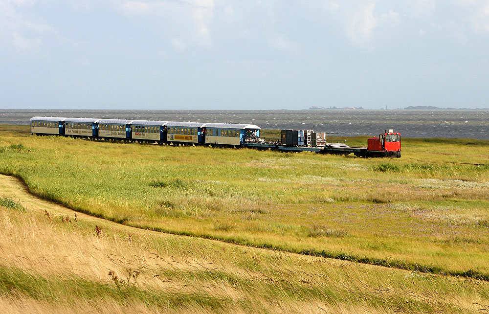 Die FAUR-Lok »399 105-6« zieht bei Hochwasser einen gut besetzten Zug vom Bahnhof zum Westanleger.