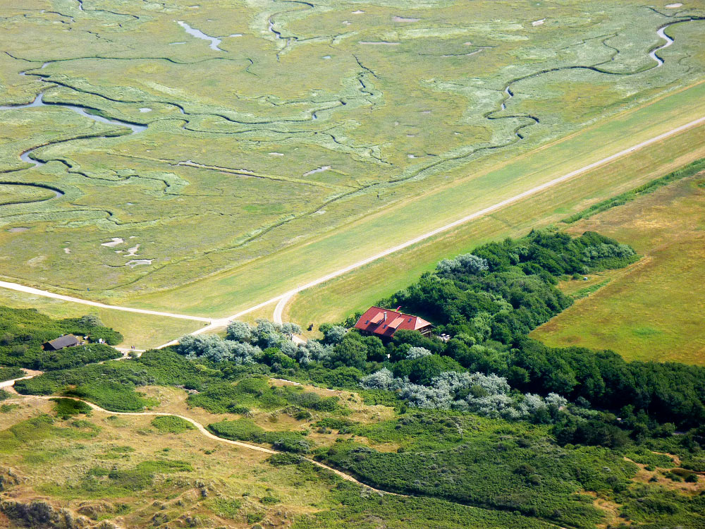 In der oberen Bildhälfte erstreckt sich der Ostaußengroden mit seinem weitverzweigten Prielnetz. Geteilt werden Außen- und Innengroden vom Ostgrodendeich, der deutlich zu erkennen ist. Weiter unten sehen Sie das »Café Neudeich« sowie die Vogelwarte des »Mellumrats« (links).