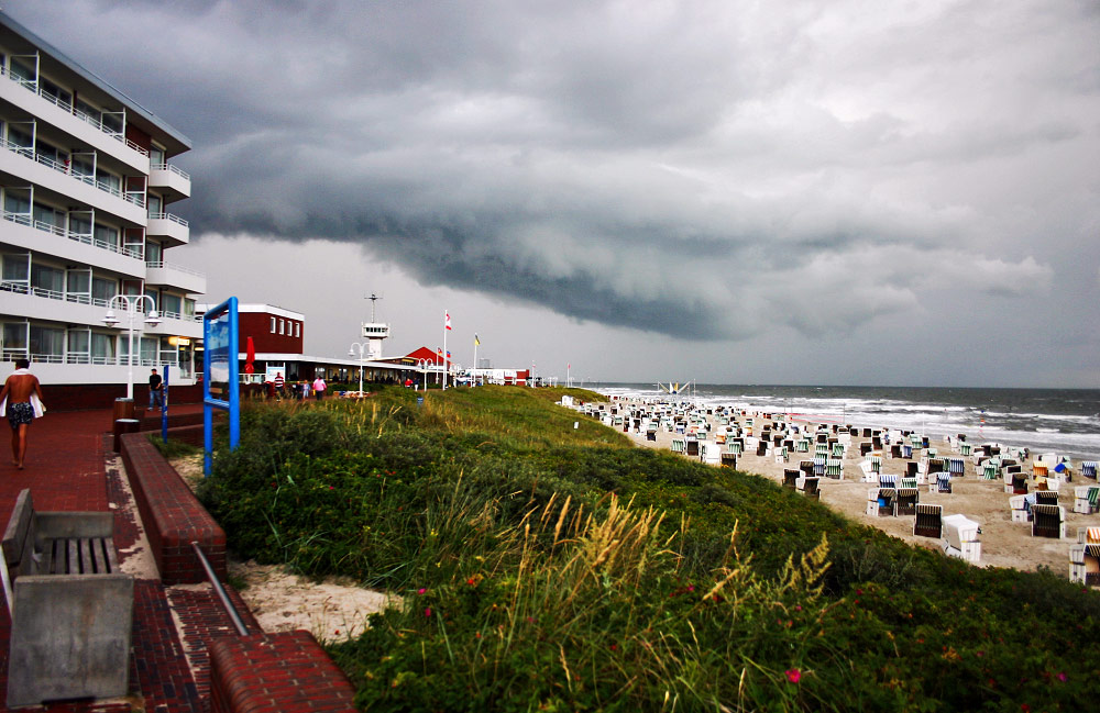 Die dunklen Regenwolken nähern sich rapide, es wird Zeit, den Wandelgang an der westlichen Strandpromenade aufzusuchen. Als Nordseeurlauber kann man so etwas schon einmal hinnehmen…