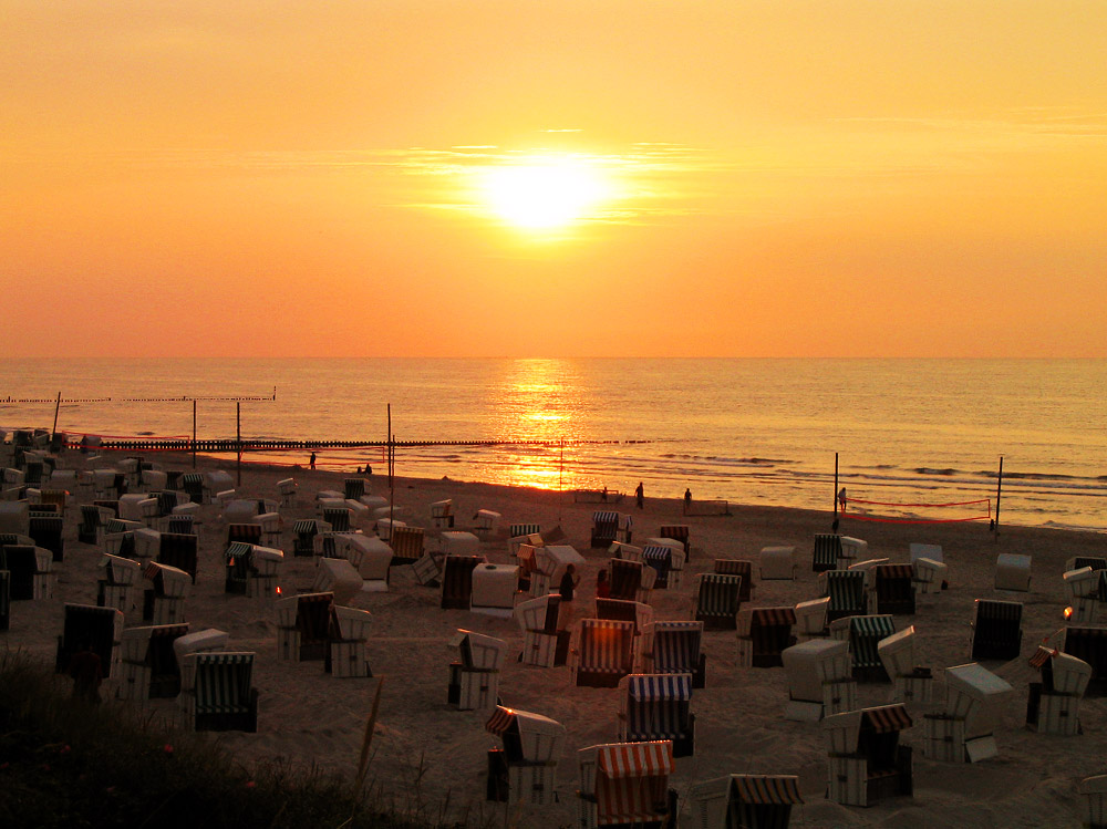 Ein Sommerabend, wie er im Bilderbuch steht. Einige wenige Urlauber genießen unten am Strand den lauen Abend, umso mehr Spaziergänger erwarten zur gleichen Zeit auf der Strandpromenade den nahenden Sonnenuntergang.