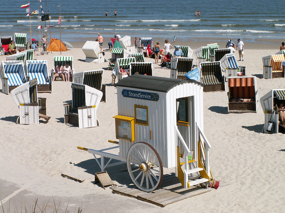 Blick von der Strandpromenade auf die Westfeld-Badekarre, die die Aufschrift »StrandService« trägt.