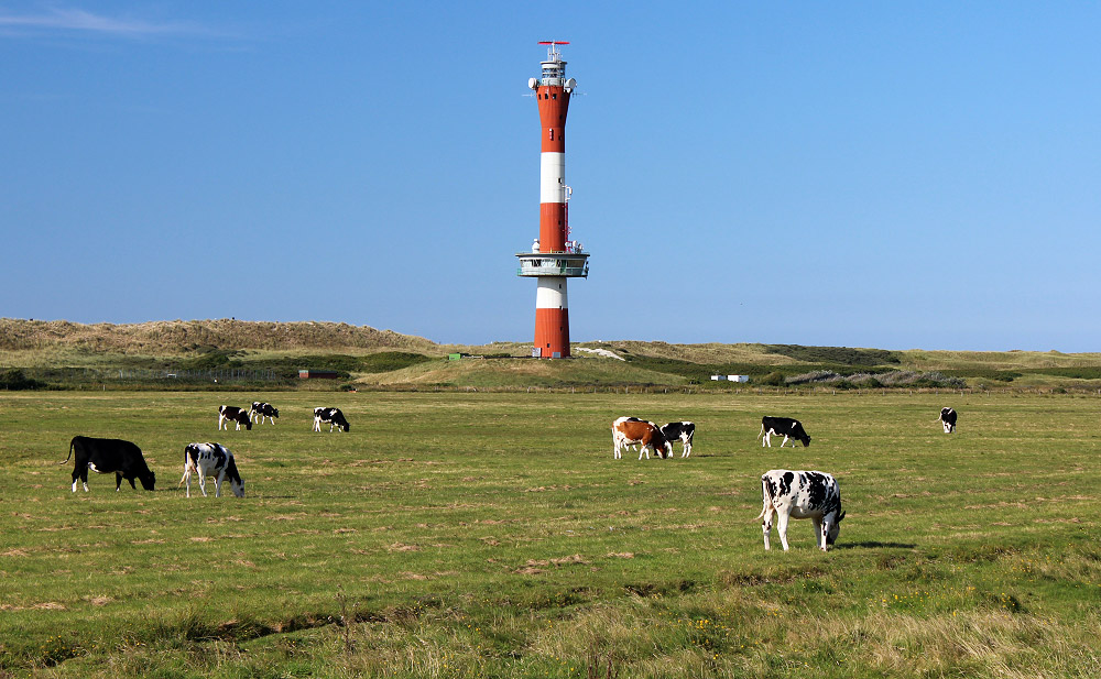 Da sind sie nun doch zu sehen, die grasendenden, vorwiegend schwarz-bunten Rindviecher. Im Hintergrund der Neue Leuchtturm mit seinem charakteristischen Mittelgeschoß.