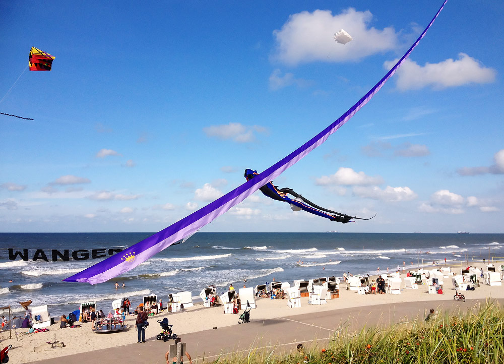 Einer der Drachen trägt sogar den Schriftzug »Wangerooge« – praktisch für die Urlauber, die vergessen haben, auf welche Insel sie gefahren sind. Darunter sind einige Strandkörbe des Westfeldes und ein kleiner Spielplatz zu sehen.