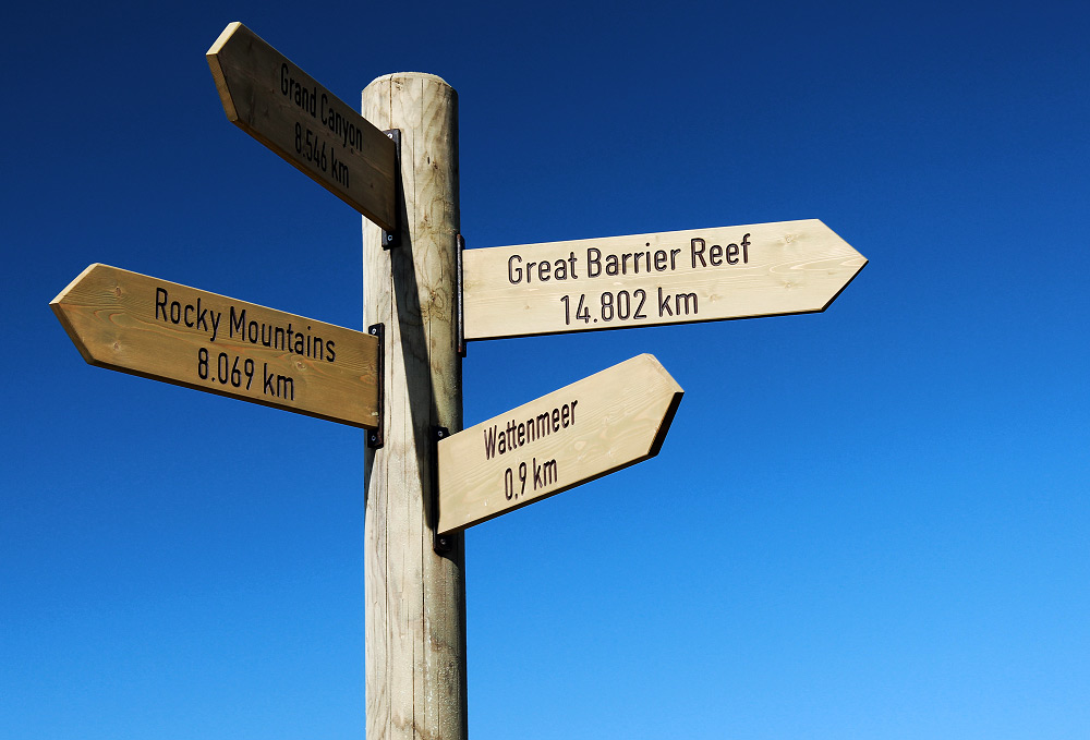 Dieser Wegweiser an der Strandpromenade ist natürlich symbolisch gemeint: Er weist auf die weltbekannten UNESO-Weltnaturerbestätten Grand Canyon, Great Barrier Reef und die Rocky Mountains, aber auch auf das Wattenmeer direkt vor unserer Haustür hin, das ebenso zum Weltnaturerbe zählt.