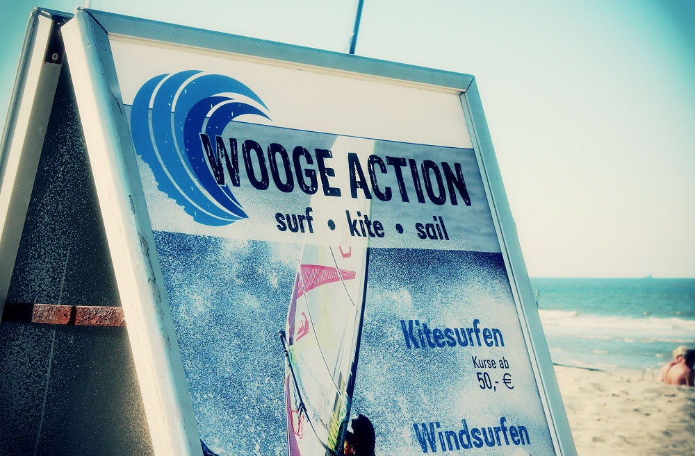 Möchte man nicht nur faul in der Sonne herumliegen, bietet sich für den Sommerurlaub auf Wangerooge ein Surfkurs an. Hier am Surfstrand sind wir richtig, dieses Schild weist unter der Überschrift »Wooge Action – surf · kite · sail&laqo; auf die verschiedenen Kurse hin.