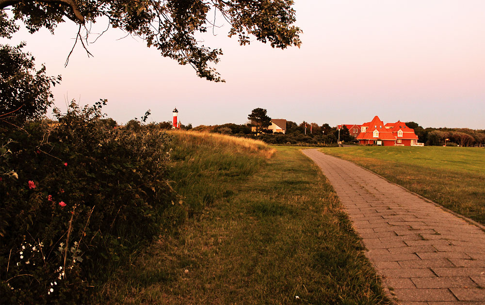 Nun sind wir auf einer abendlichen Spazierfahrt in den Westen. Ein Blick zurück zum Dorf mit Altem Leuchtturm und der »Lagune am Wattenmeer«.