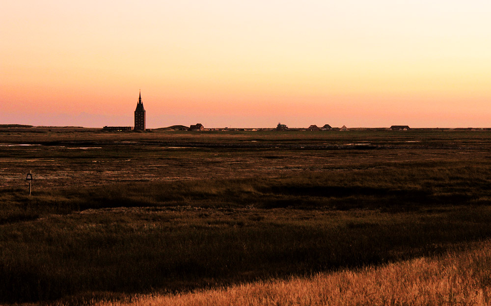 Zur Ruhezone des Nationalparks gehören die Salzwiesen vor uns, vom Deich aus haben wir aber einen guten Blick auf selbige. Am Horizont sehen Sie das Westdorf mit dem Westturm.