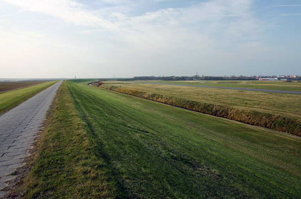 Wir sind nun ein Stückchen in Richtung Westen weitergefahren. In der rechten Bildhälfte sehen Sie den Deichgraben und daneben die Start- und Landebahn des Inselflugplatzes. Die Lichtverhältnisse vermitteln bereits einen recht herbstlichen Eindruck.