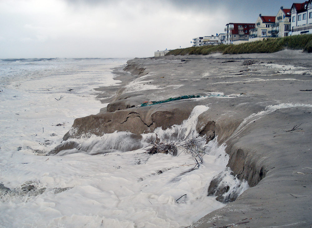 Die Abbruchkante ist zwar nicht besonders hoch, vergrößert sich aber stetig. Nach dieser Sturmflut werden große Sandverluste am Hauptstrand, aber auch im Osten und Westen zu beklagen sein.