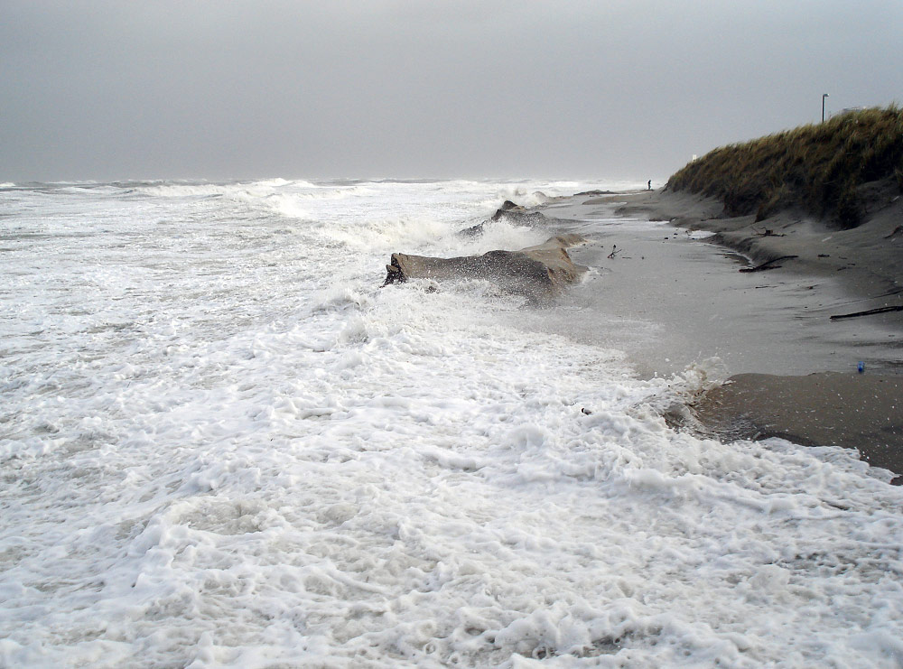 Die größten Wellen überspülen an dieser Stelle die Strandmauer und gelangen bis an den Dünenfuß unterhalb des Freizeitbades &raqo;Oase«.