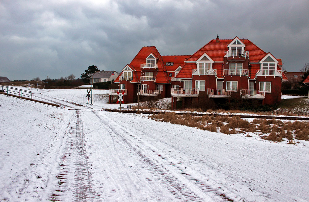 In der rechten Bildhälfte erkennen Sie die »Lagune am Wattenmeer«, die durch die roten Dächer auch aus weiter Entfernung gut zu erkennen ist.
