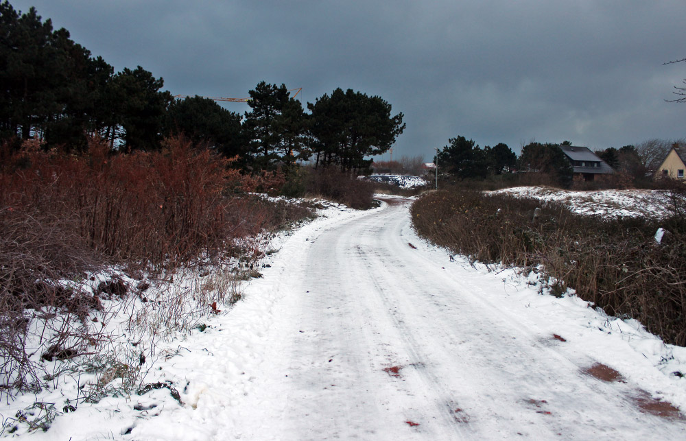 Der Kran hinter den Kiefern gehört zur Baustelle des neuen Feuerwehrgebäudes. Rechts ein kleiner Teil der Osterdünen.