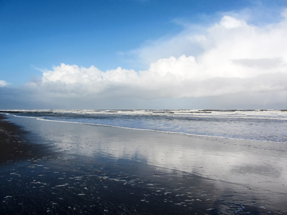 Die Wolken spiegeln sich auf dem nassen Strandsand, ein schönes Licht-, Schatten- und Farbenspiel.